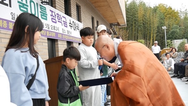 5일 김해 불인사 '제2회 꿈이룸 장학금' 전달식에서 주지 송산 스님이 장학증서를 전달하는 모습.