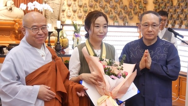 (사)김해파라미타청소년협회 출범식에서 윤수정 (사진 가운데) 초대회장에 위촉장을 전달하고 기념촬영하는 모습.(사진 왼쪽, 초대총재 불인사 주지 송산스님, 사진 오른쪽 (사)경남파라미타청소년협회 김재호 회장)